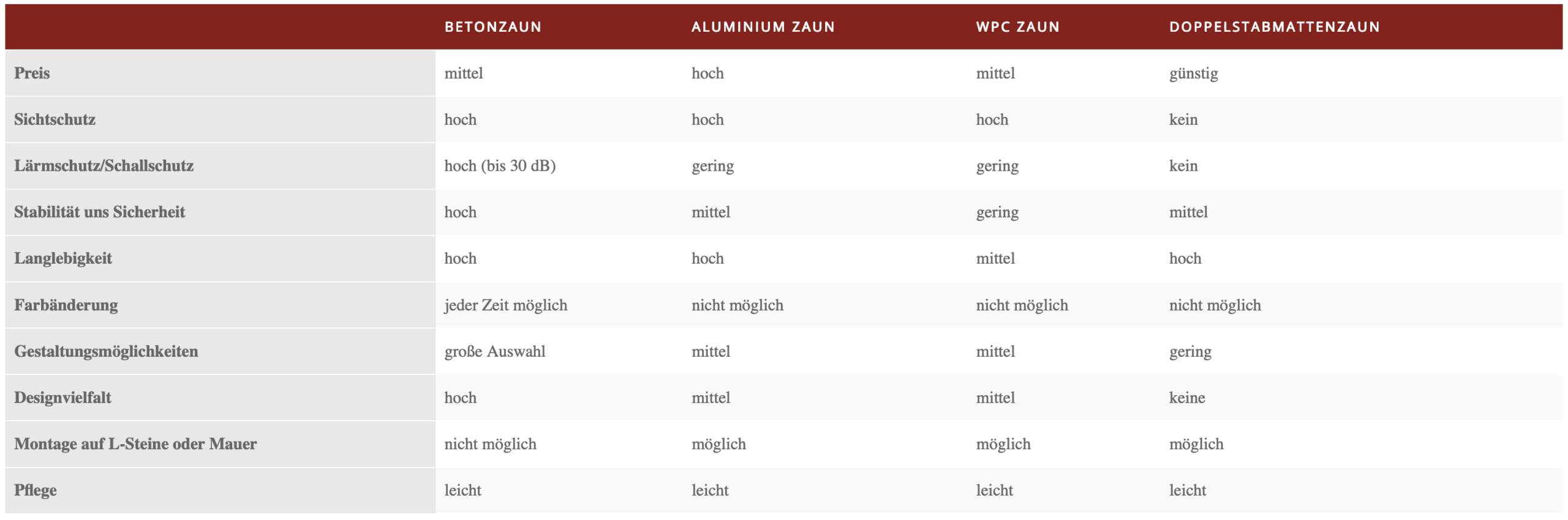 In unserer Vergleichstabelle haben wir die wichtigsten Kriterien und Merkmale der verschiedenen Zaunarten übersichtlich dargestellt – von Optik und Pflegeaufwand über Haltbarkeit und Preis bis hin zu Sicht- und Schallschutz.